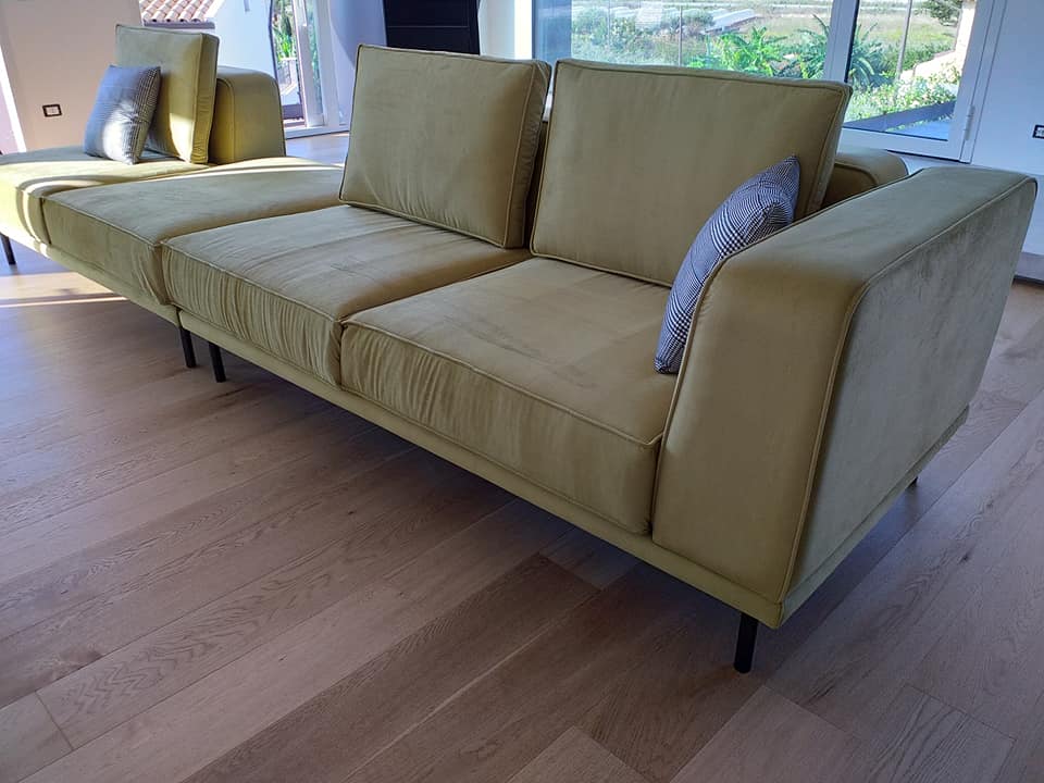 I divani sono realizzati in legno massello e rivestiti con materiali di alta qualità come velluto, microfibra e stoffe ignifughe.